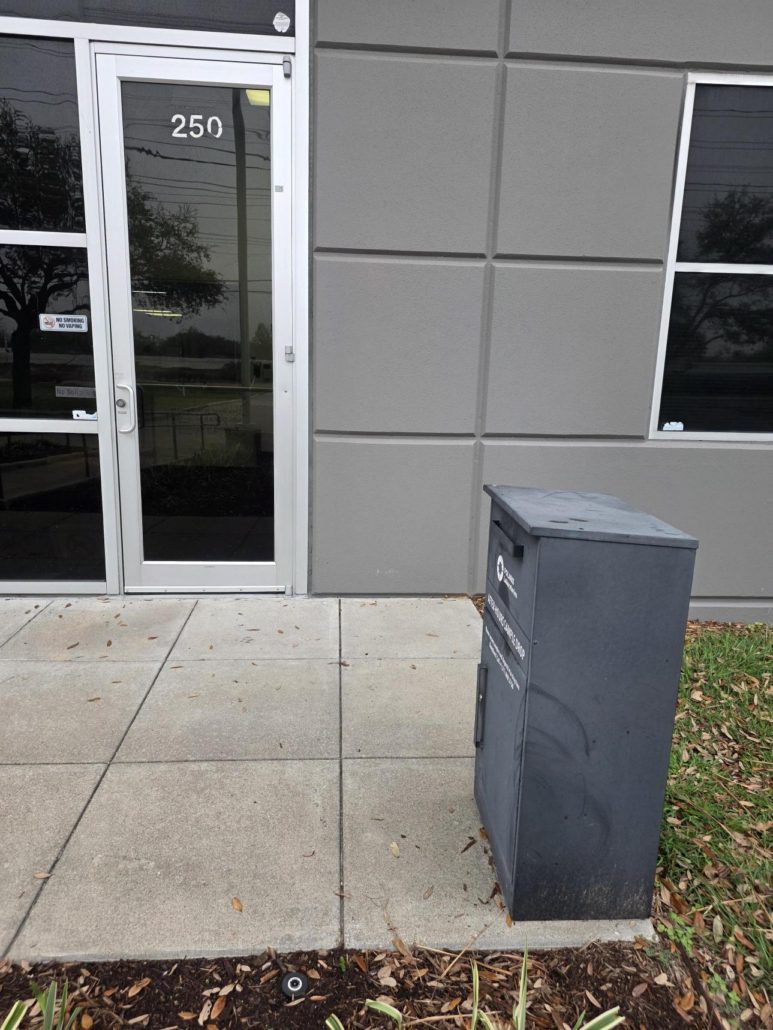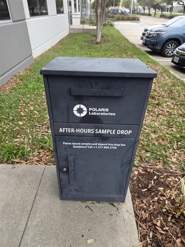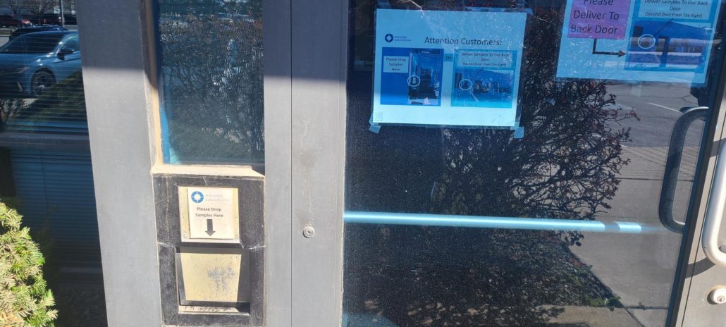 Samples can be dropped off in the drop off box located around the back of the building by loading dock door #4. Samples can be dropped off at any time.