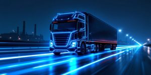 Red semi truck driving on highway at night with blue neon light trails. Modern freight transportation on dark road with glowing effects. Future delivery concept with motion trails